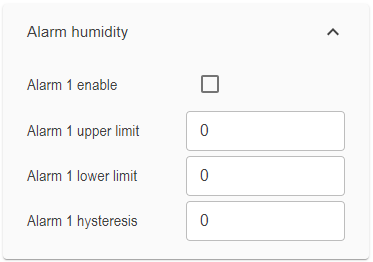 - 湿度(アラーム1)、温度(アラーム2)、および演算値(アラーム3)に対してアラーム条件を設定できます。設定された低いアラーム値以下、または高いアラーム値以上の値が検出されると、アラームがトリガーされます。